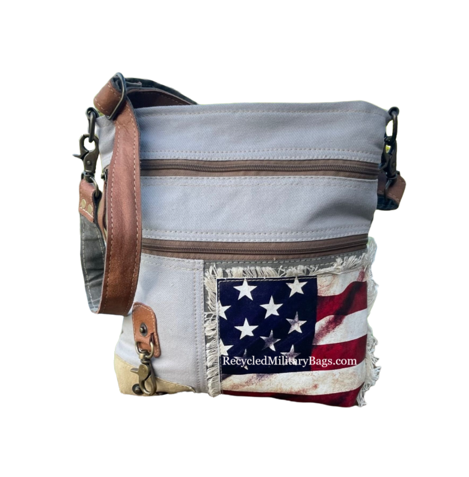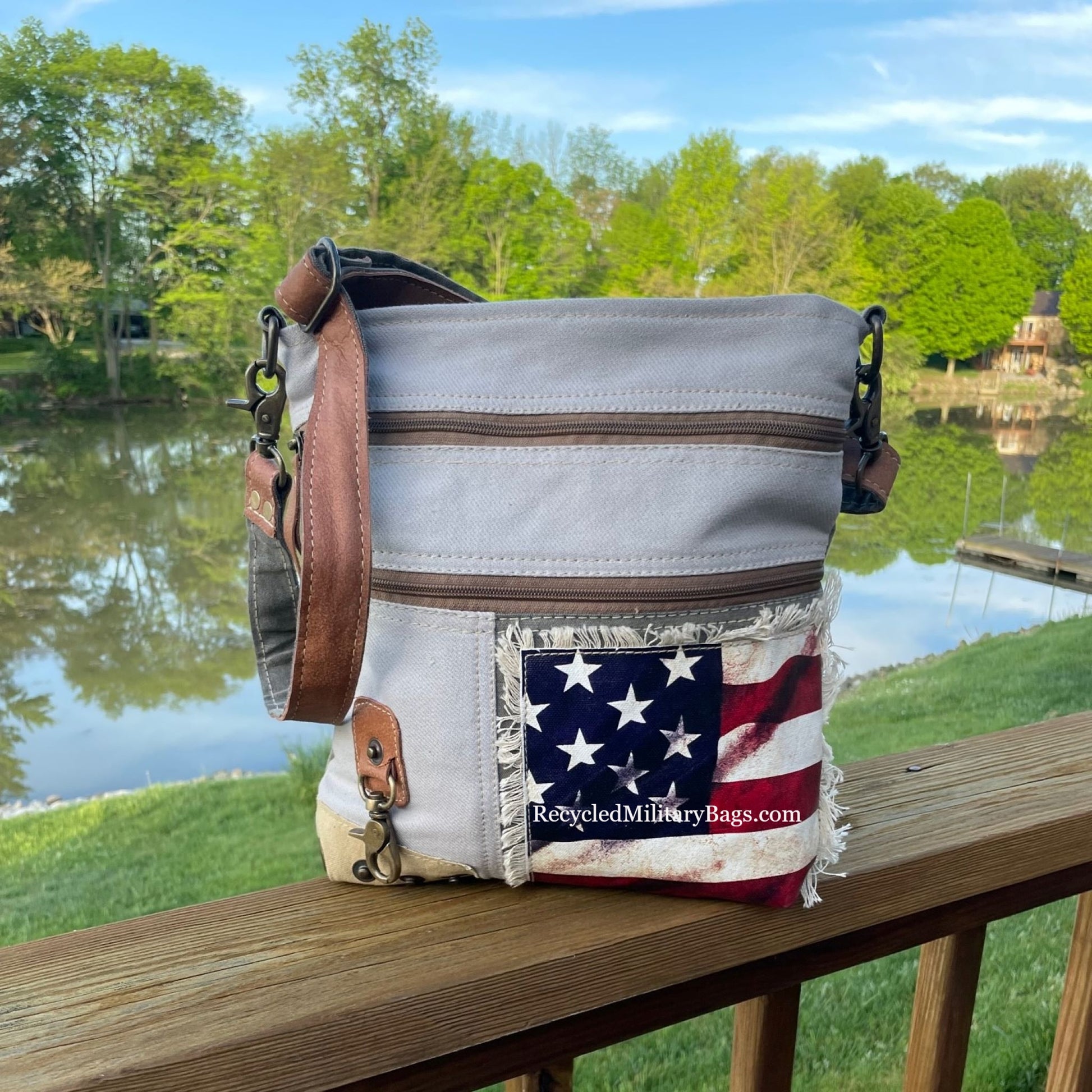 Our American Flag Crossbody Bag is the perfect Patriotic Sustainably Military Canvas Bag! Recycled into a durable and strong canvas bags that will last for years to come and show your American Pride for our America, Veterans and our Military.