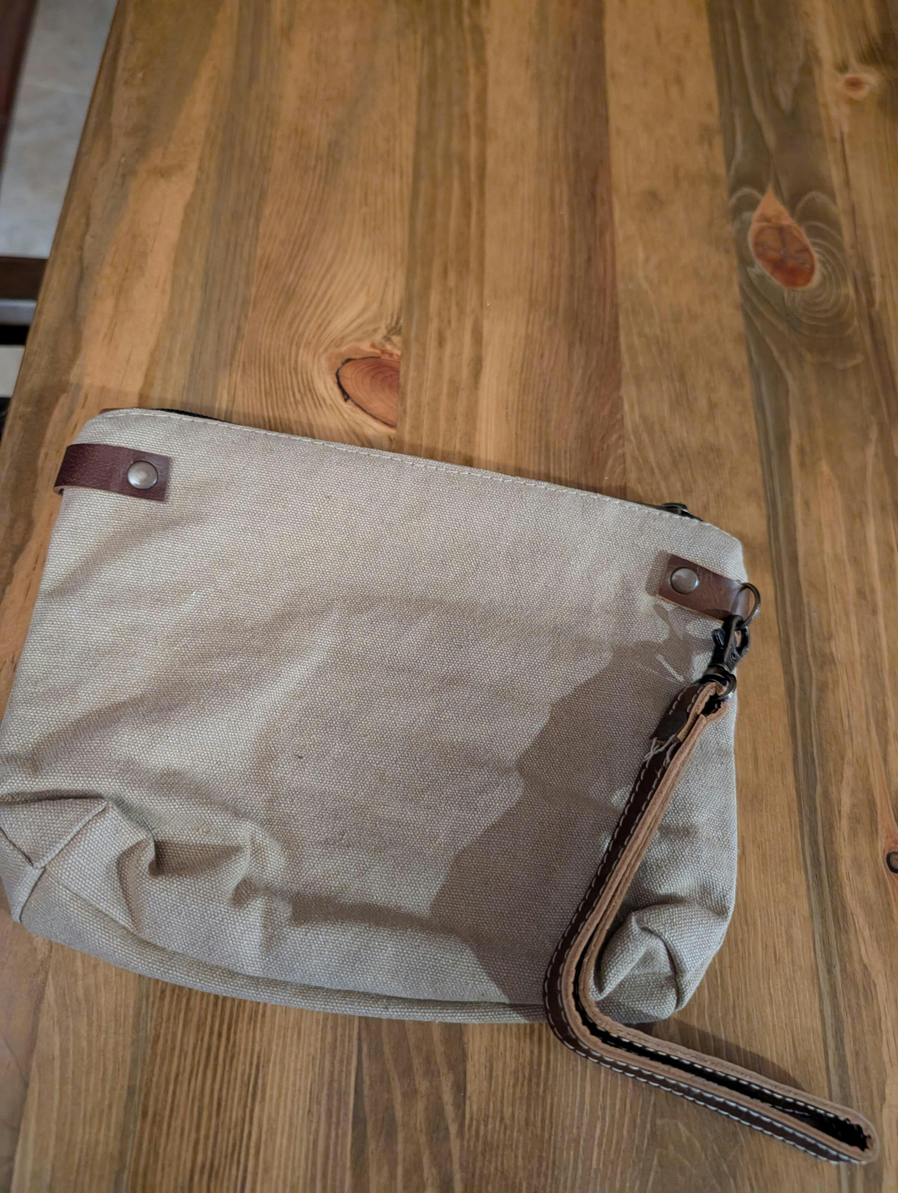 Meet your new go-everywhere pouch, made from ruggedly stylish recycled military canvas and designed to do it all with a Queen Bee print. Perfect to pair with one of our Bags or to use alone. With a removable wrist strap, this little hero transforms from a carry-all to a makeup bag to a night-out wristlet in seconds flat. It’s the perfect size to stash inside your tote or fly solo on quick errands. Durable, versatile, and effortlessly cool—this pouch is ready for whatever your day throws at you. Perfect for a one-of-a-kind gift for anyone who loves style with a story.