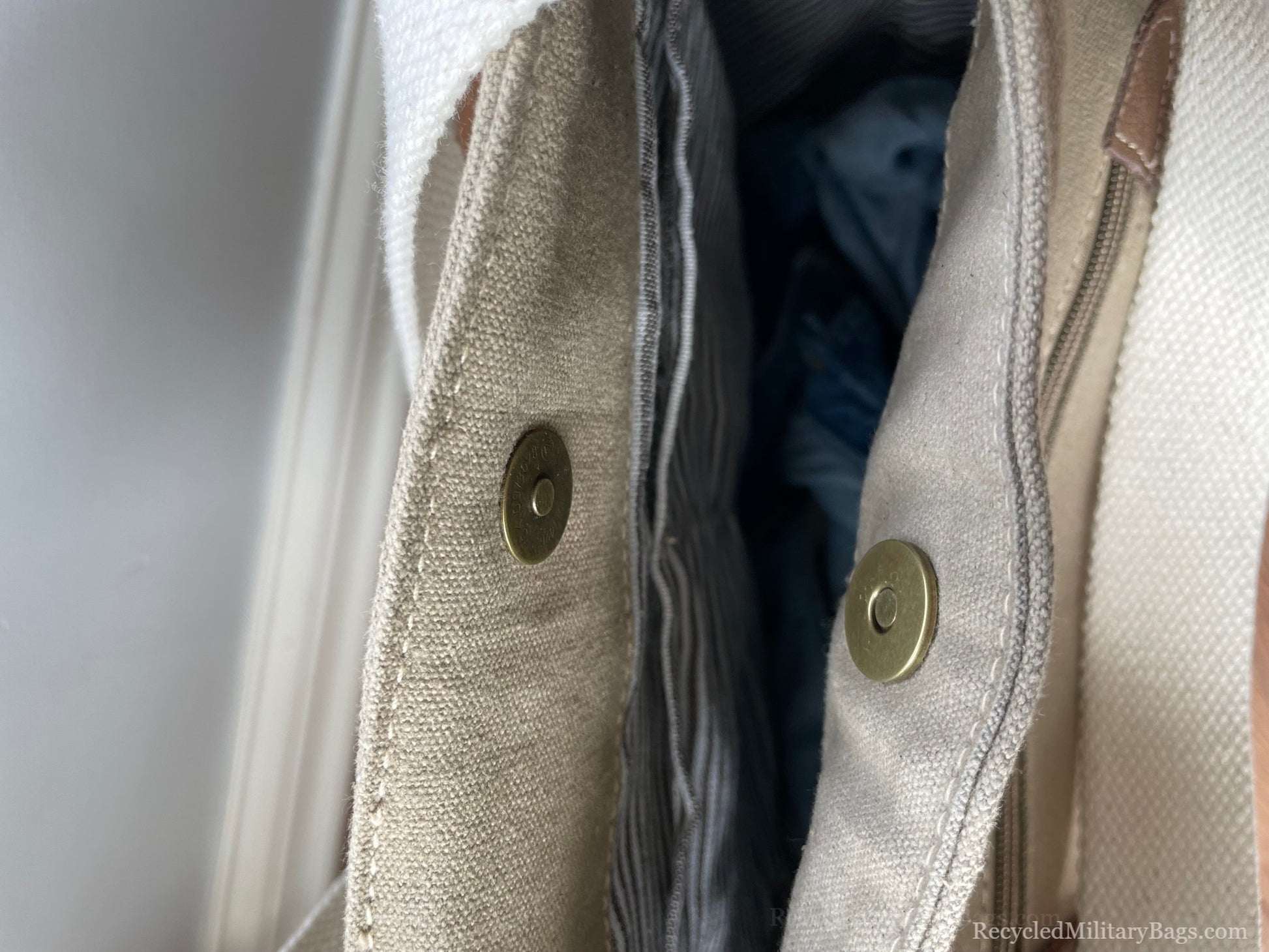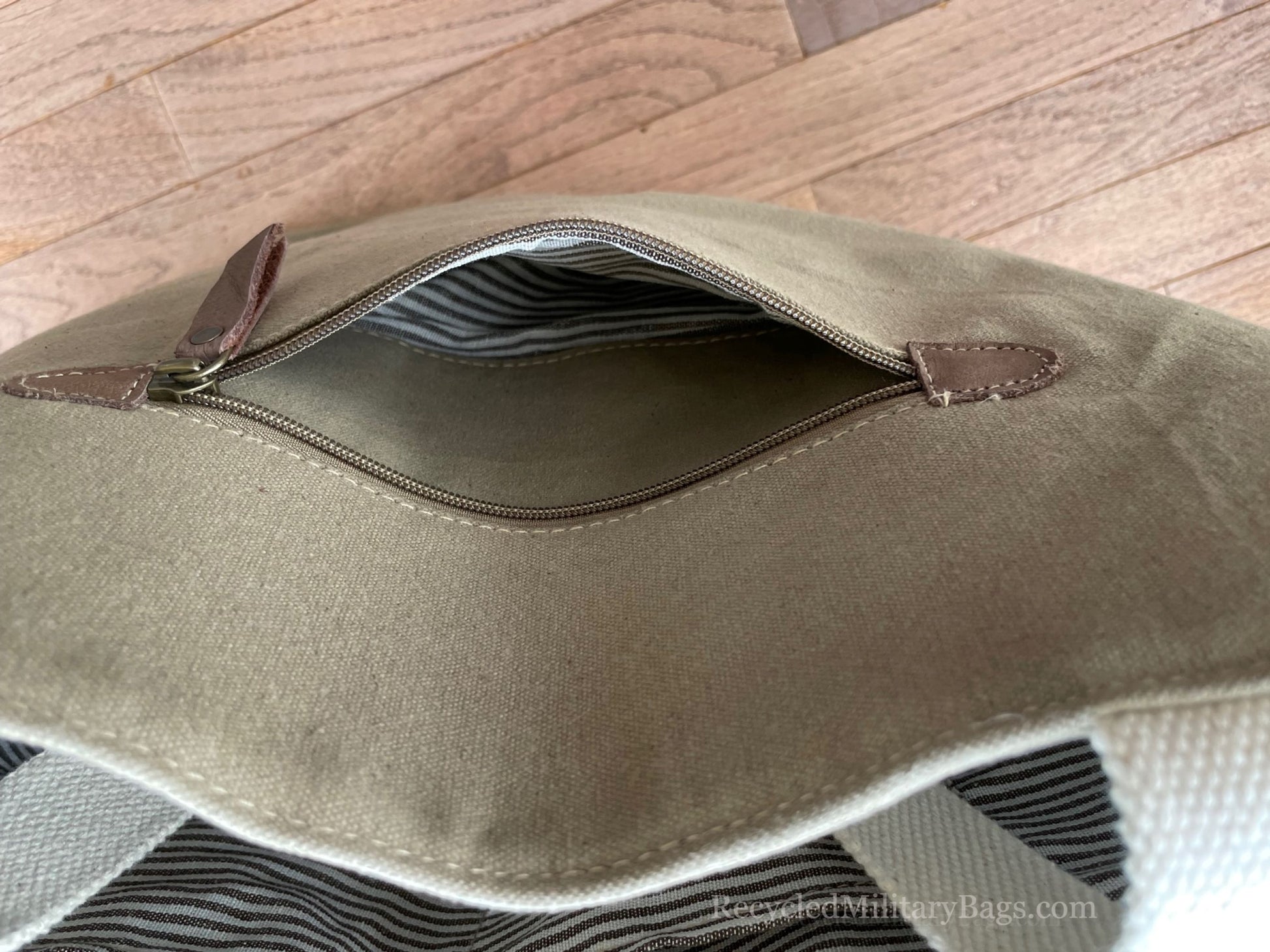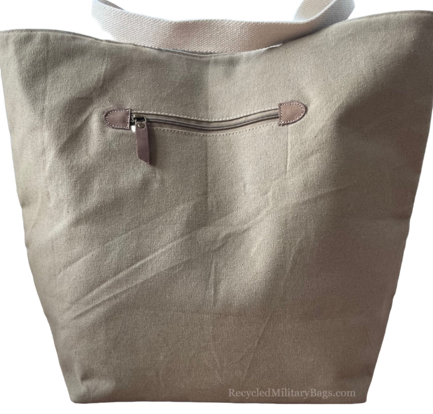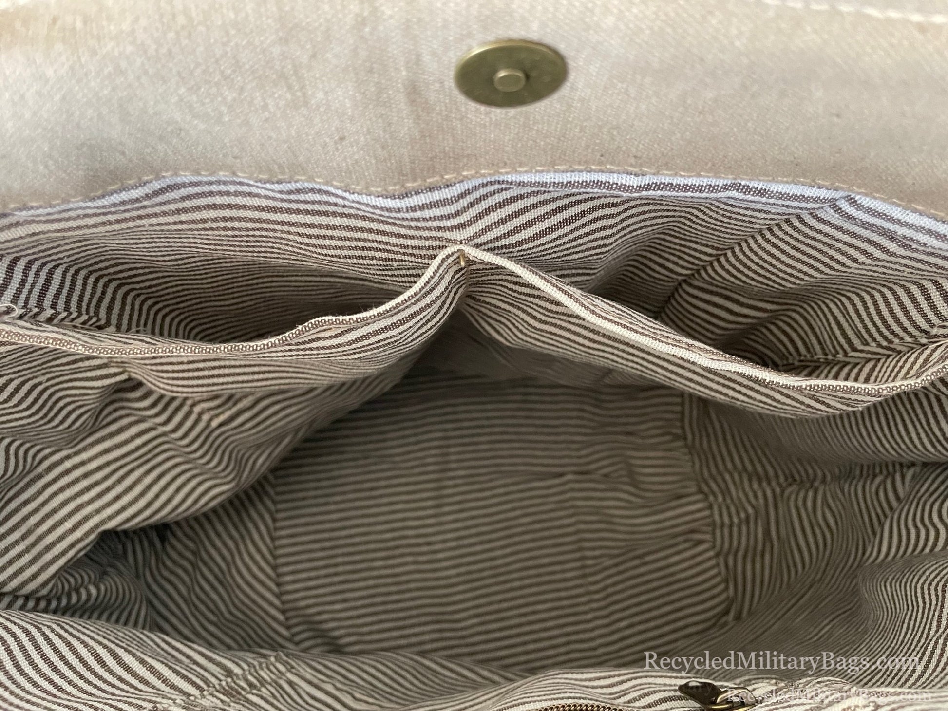 Generously sized for everything you need with a back zip pocket and 2 inside slip pockets and an additional zip compartment to keep your necessities within easy access. Handcrafted from repurposed and upcycled military canvas.