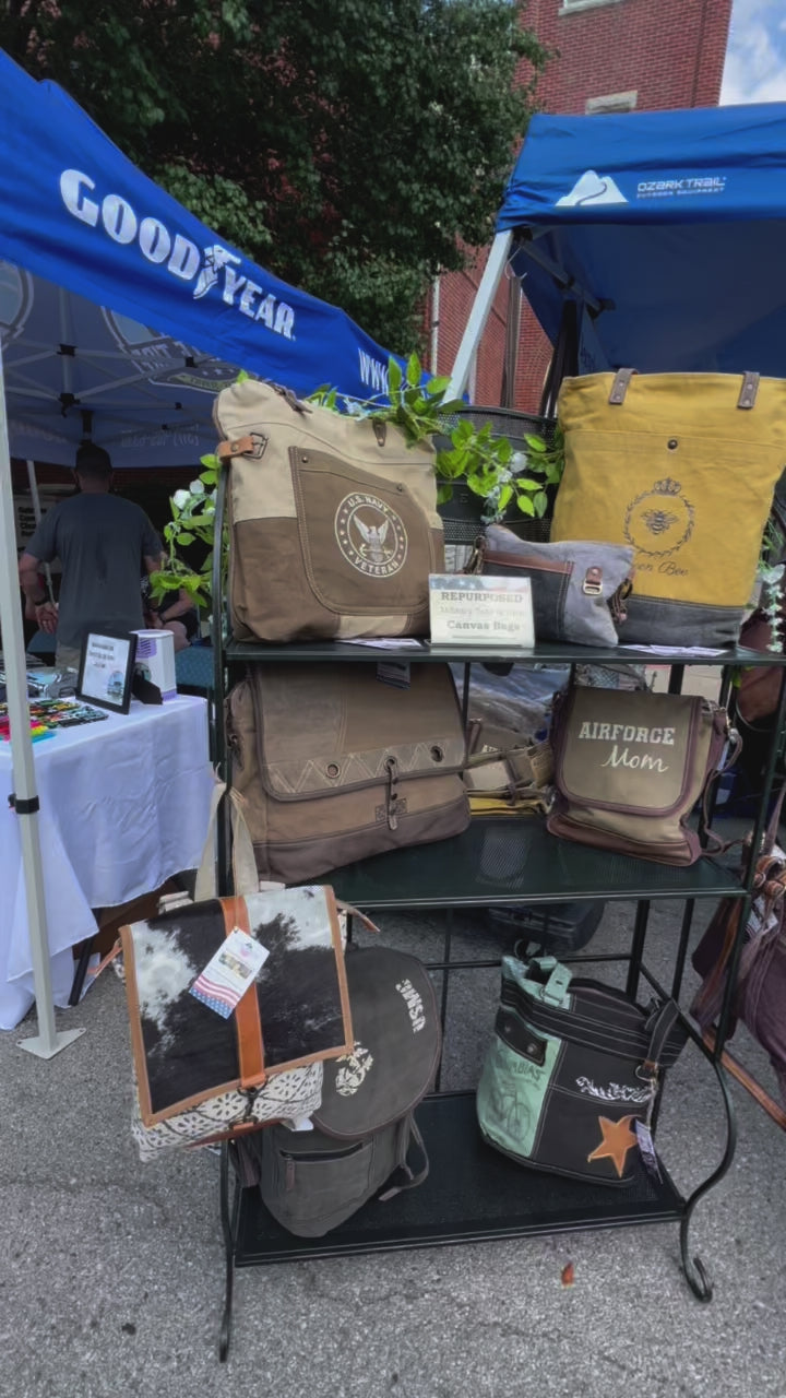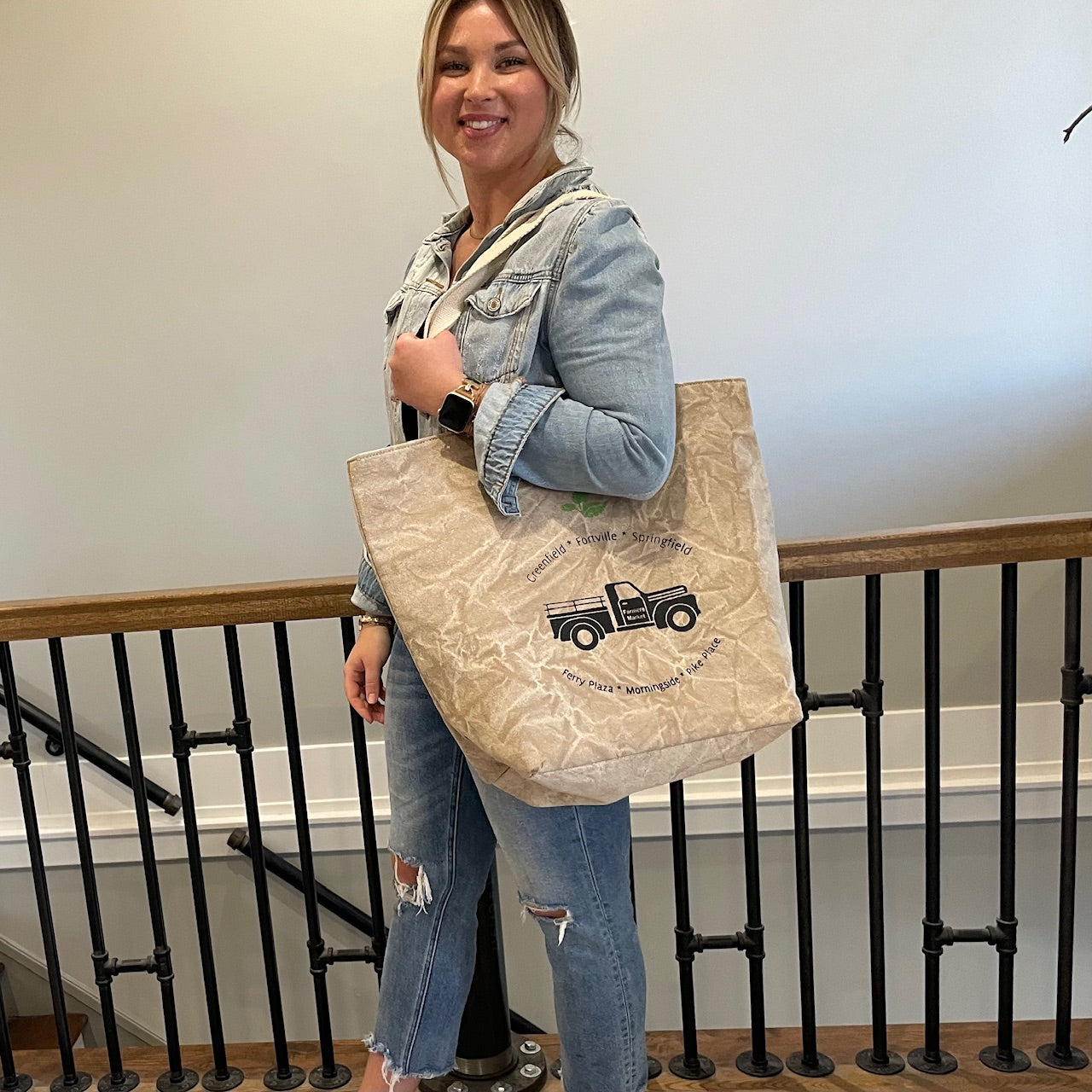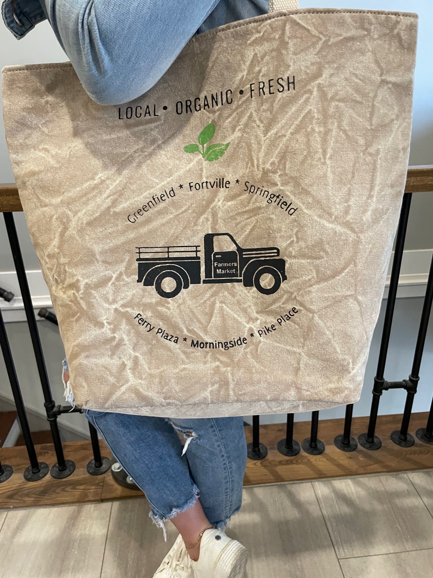 Large Market Tote. Shop local and carry in style. Repurposed and Upcycled Sustainable Military Canvas Farmers Market Bag with Pike Place, Ferry's Plaza, Morningside, Greenfield and Springfield city and markets.