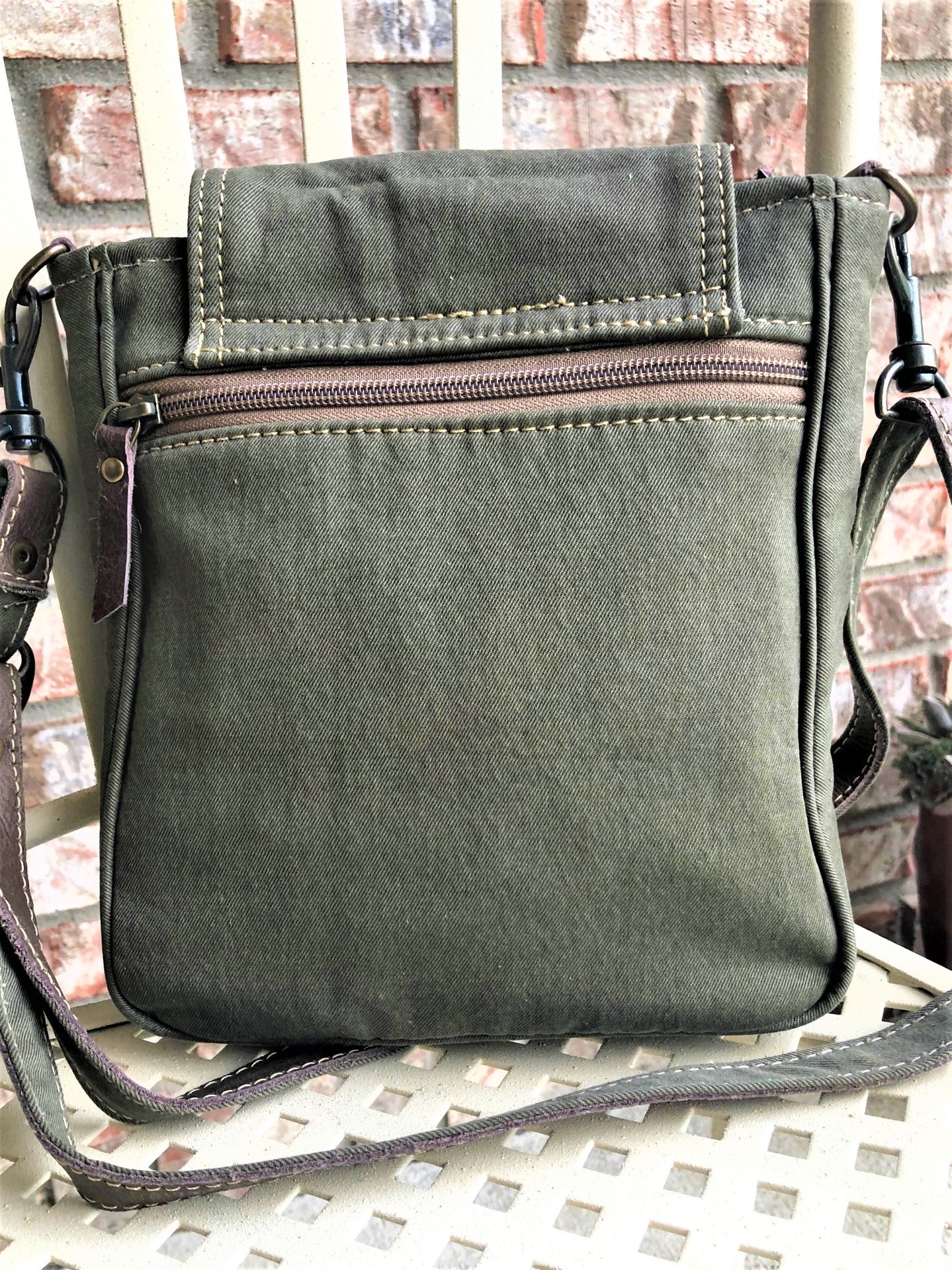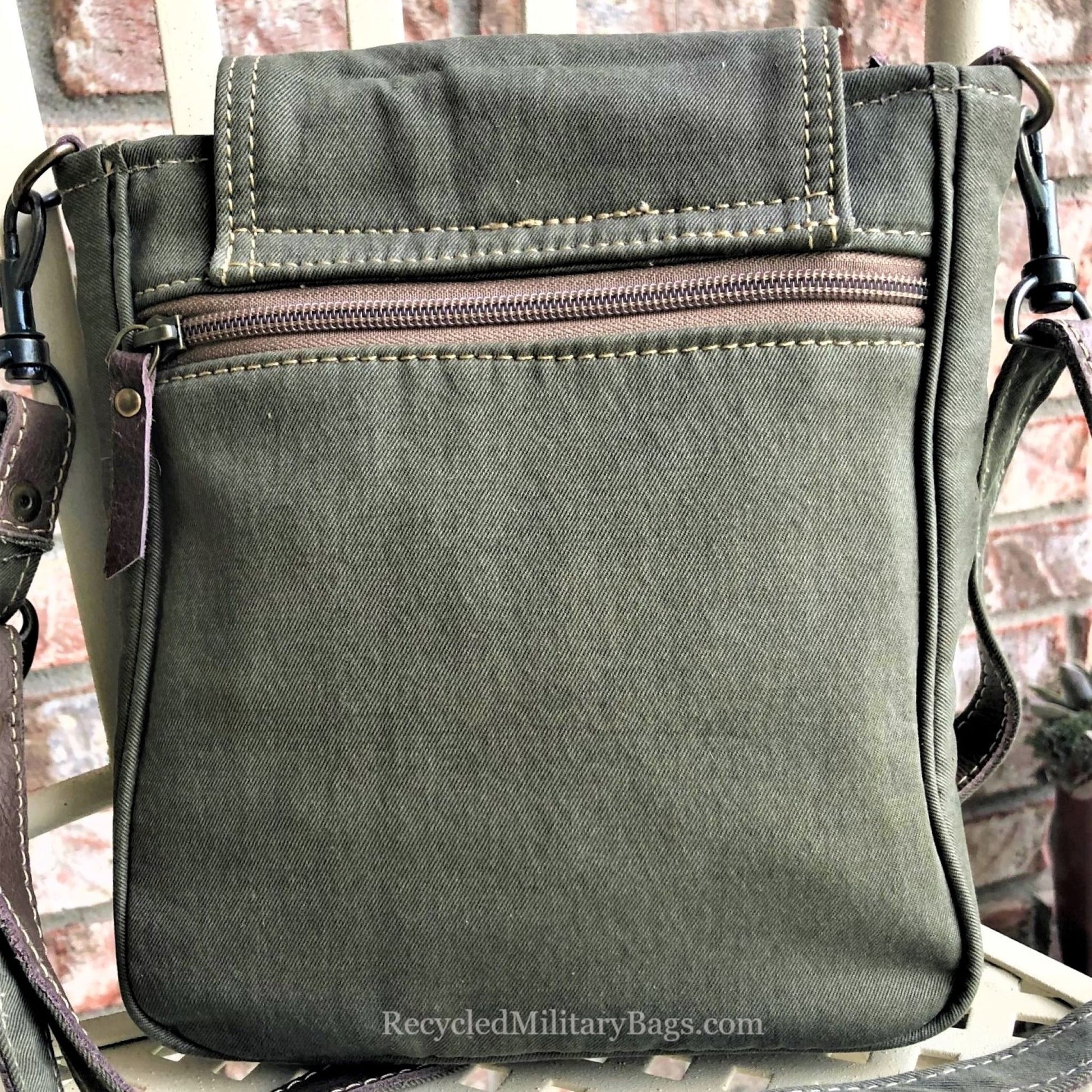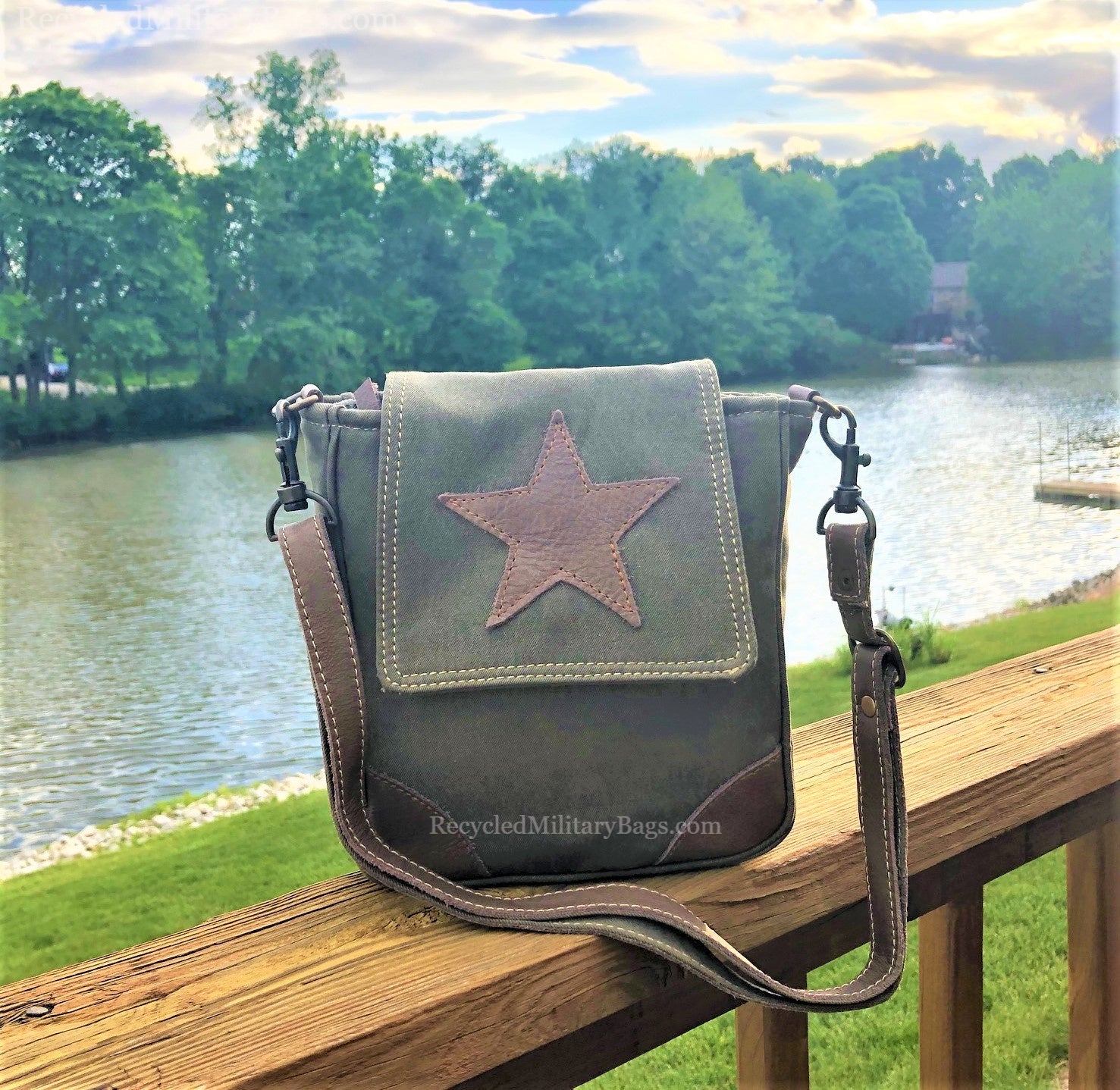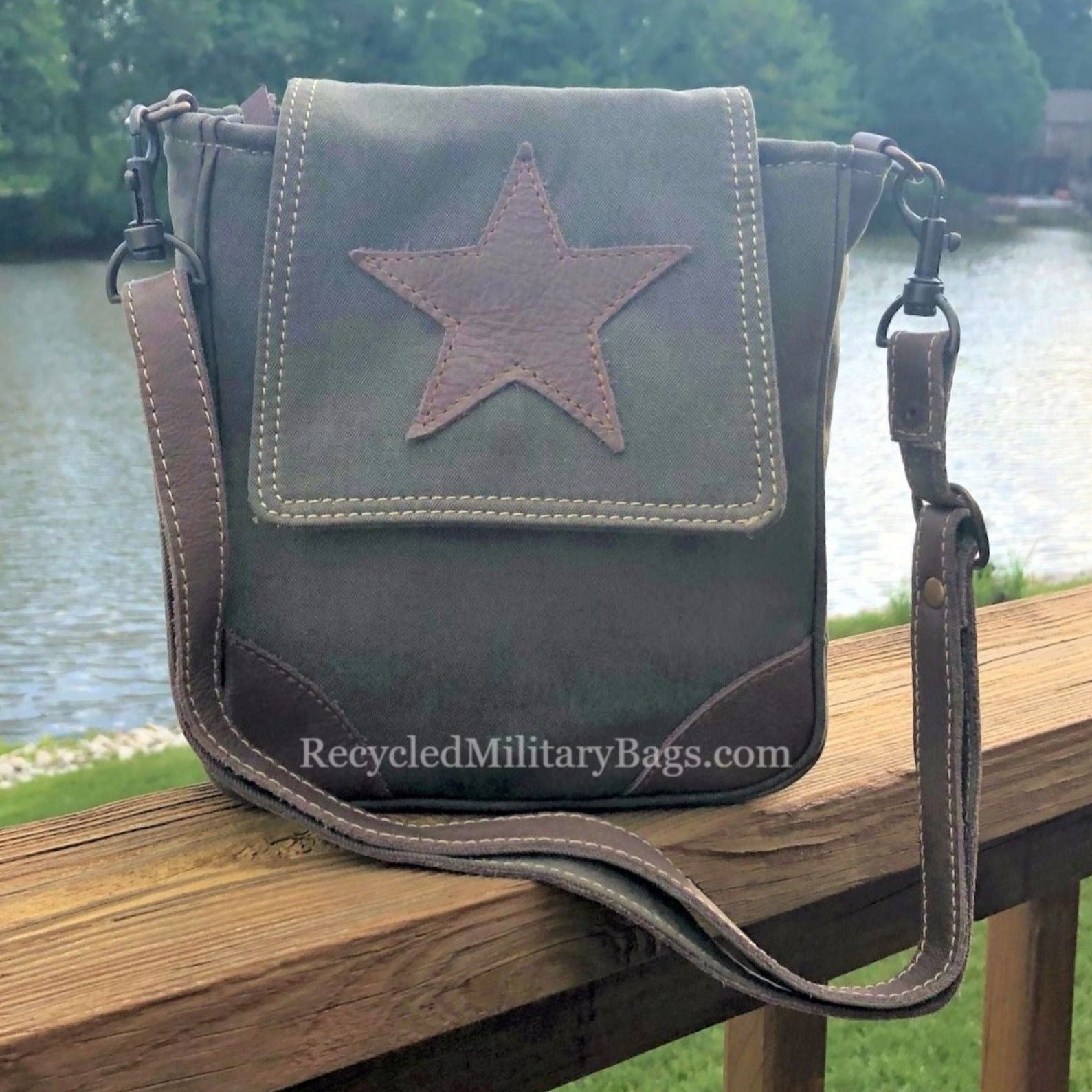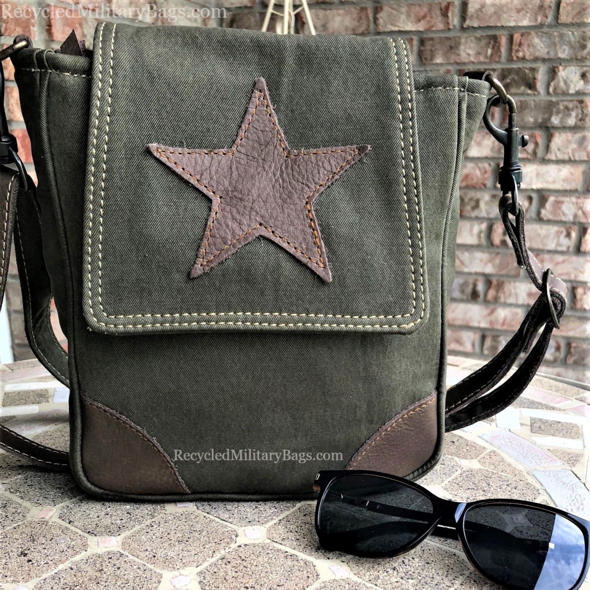 A great find and gift! Greenish-Brown Sustainable Canvas Crossbody Bag has a leather star and is a great small to medium sized military canvas crossbody bag crafted of upcycled and repurposed Military Canvas. Strap can be adjusted from shorter shoulder length to longer crossbody. A classic little bag that will stand the test of time both in durability and style.